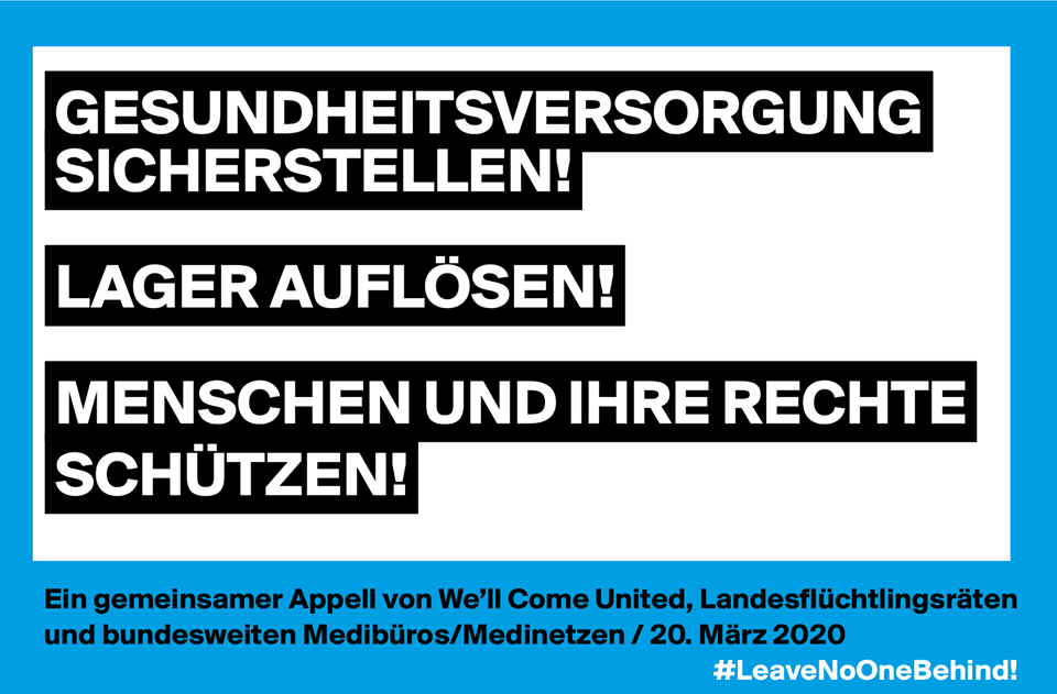 Appell vom 20. März 2020 von: We’ll Come United, die Landesflüchtlingsräte, bundesweite Medibüros/Medinetze Gesundheitsversorgung sicherstellen! Lager auflösen! Menschen und ihre…