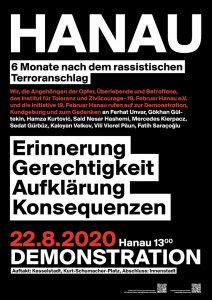 Wir, die Angehörigen der Opfer; die Überlebenden und Betroffenen; das Institut für Toleranz und Zivilcourage – 19. Februar Hanau e.V. und die Initiative 19. Februar Hanau rufen gemeinsam zur Demonstration und zum Gedenken auf: In Hanau am 22.8.2020, dem Samstag nach dem 19. August.